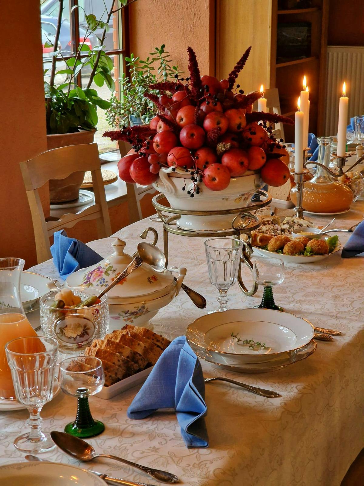 - An authentically laid table adorned with candlelight and floral arrangements.